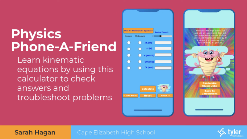 Sarah Hagan was awarded 2nd Place for “Physics Phone a Friend" and received a $2500 scholarship. The app is an educational tool to help students with physics. The core of the app features a calculator that allows students to fill in known values for kinematic equations. The app includes a mascot and jokes that are displayed when the correct answers are given.